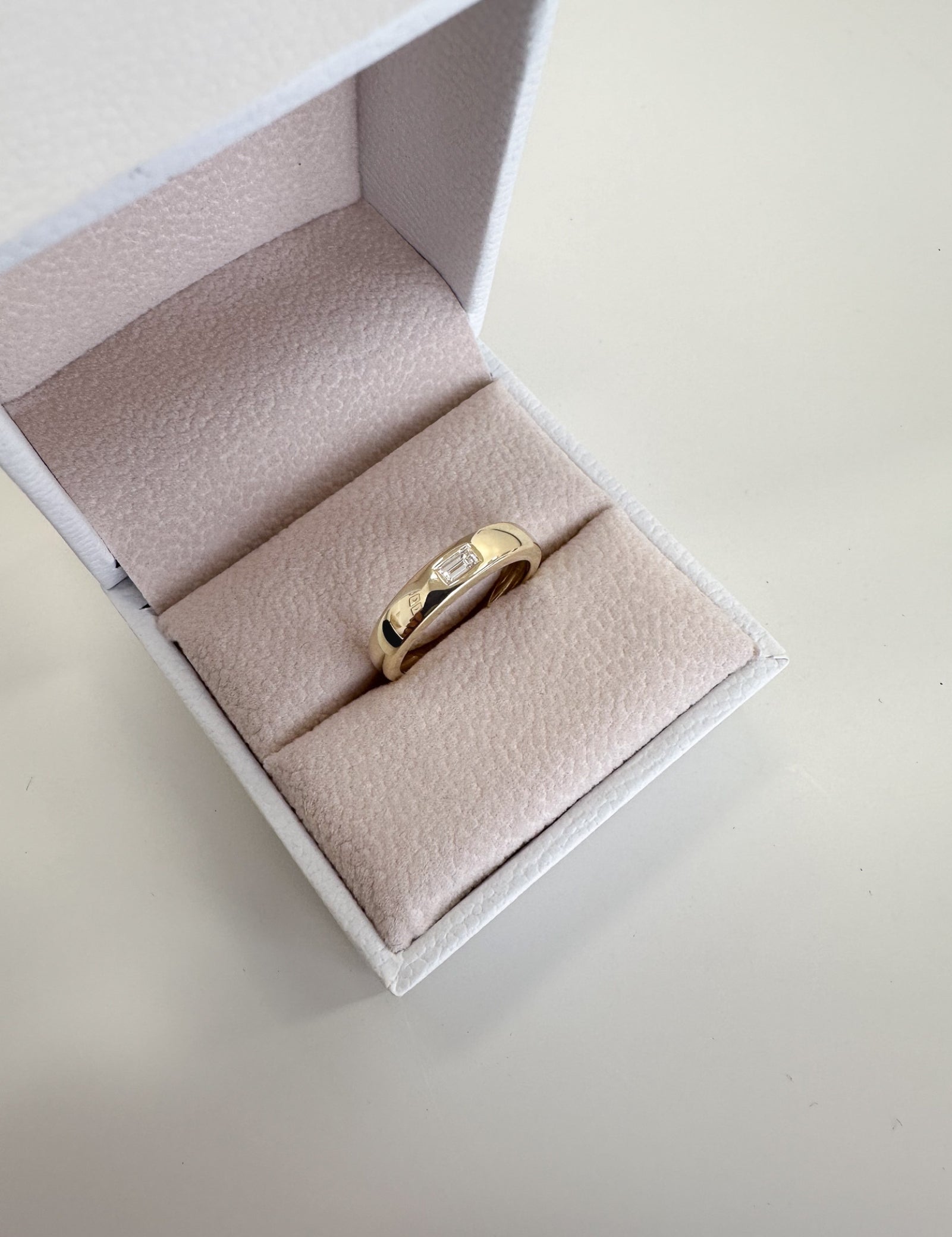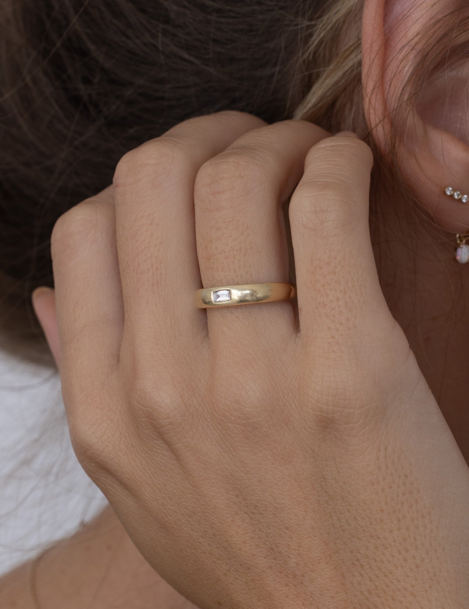 Discover the perfect balance of elegance and sparkling clarity with the Archer Ring. Crafted in solid 9K gold, it features a natural baguette diamond in a gypsy setting, embodying simplicity and sophistication.