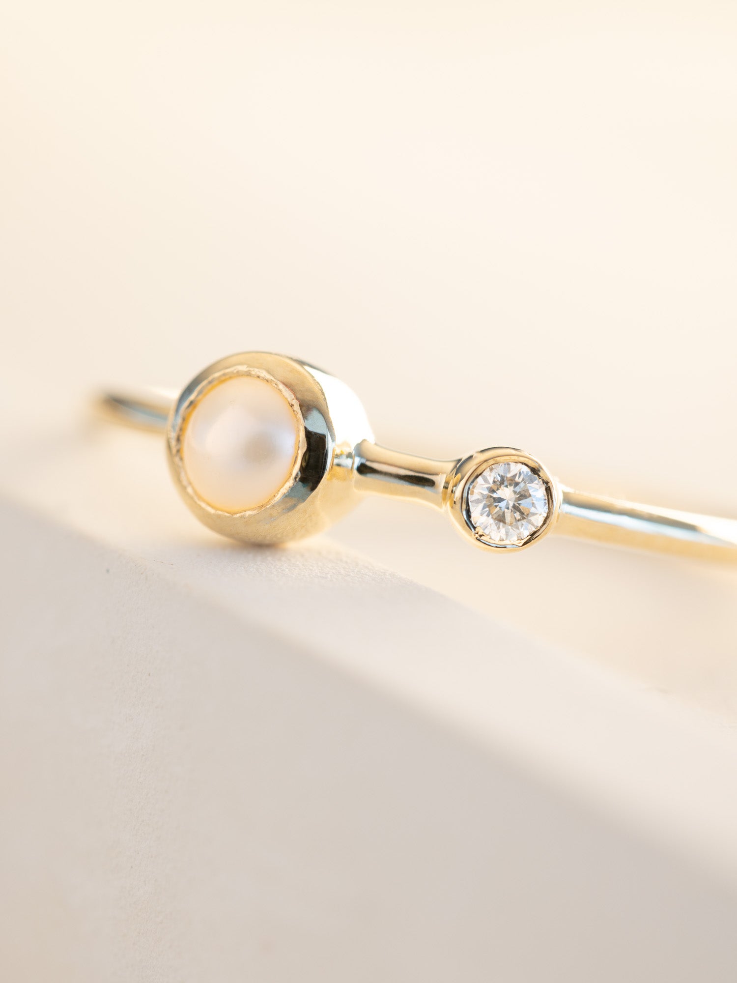 The Dara Ring has a gold weight of approximately 0.9 grams. The freshwater pearl feature is 4.5mm and the brilliant-cut white diamond is 2.5mm in size. The band is 1mm wide. Available in three sizes: small (size 6, 16.3mm internal diameter), medium (size 7, 17.1mm internal diameter), and large (size 8, 17.9mm Internal diameter).