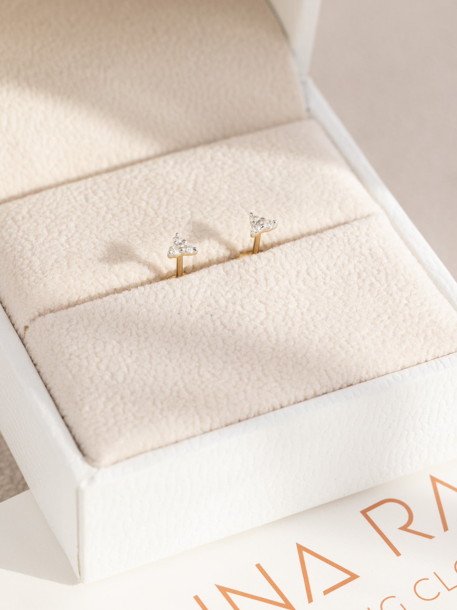 Add a touch of glamour to your everyday with the Diamond Dancer Studs from Luna Rae. Crafted from solid 9K gold, these delicate studs feature 3 brilliant white diamonds per earring that cluster perfectly like petals of a flower, offering a total of 6 diamonds for the pair.