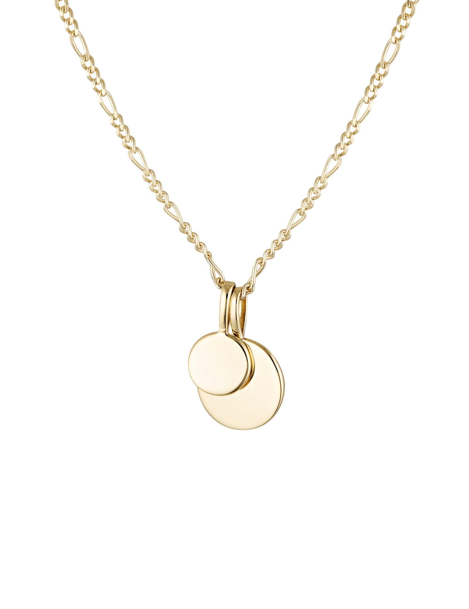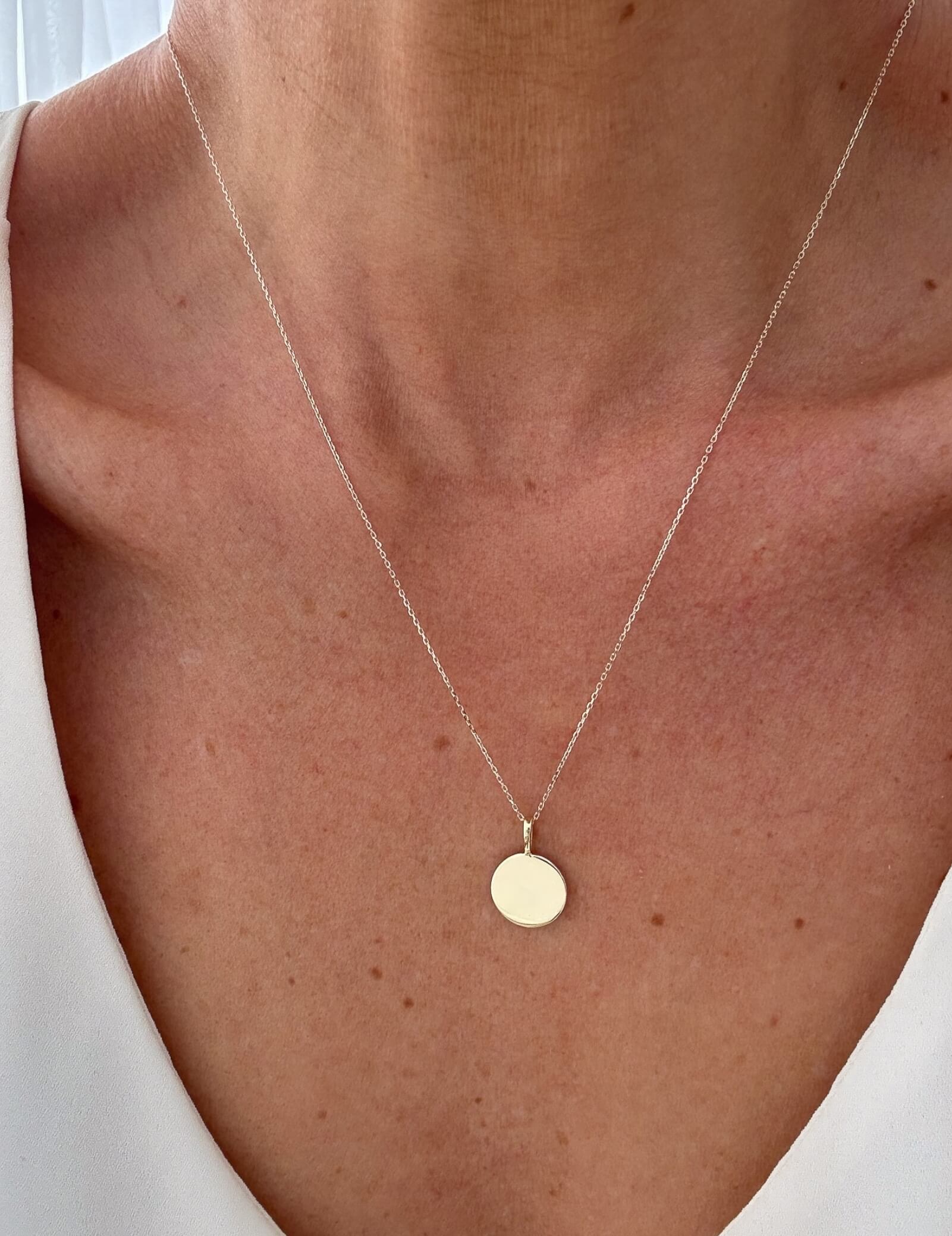 The Flat Disc Pendant comes in three sizes—Small (6 mm diameter, 0.8 mm thick, 4.7 mm bail height, 0.3 g), Medium (9 mm diameter, 0.8 mm thick, 4.7 mm bail height, 0.65 g), and Large (12 mm diameter, 0.8 mm thick, 4.7 mm bail height). Each size is lightweight and perfect for stacking, engraving, or wearing solo as a timeless, organic accent.