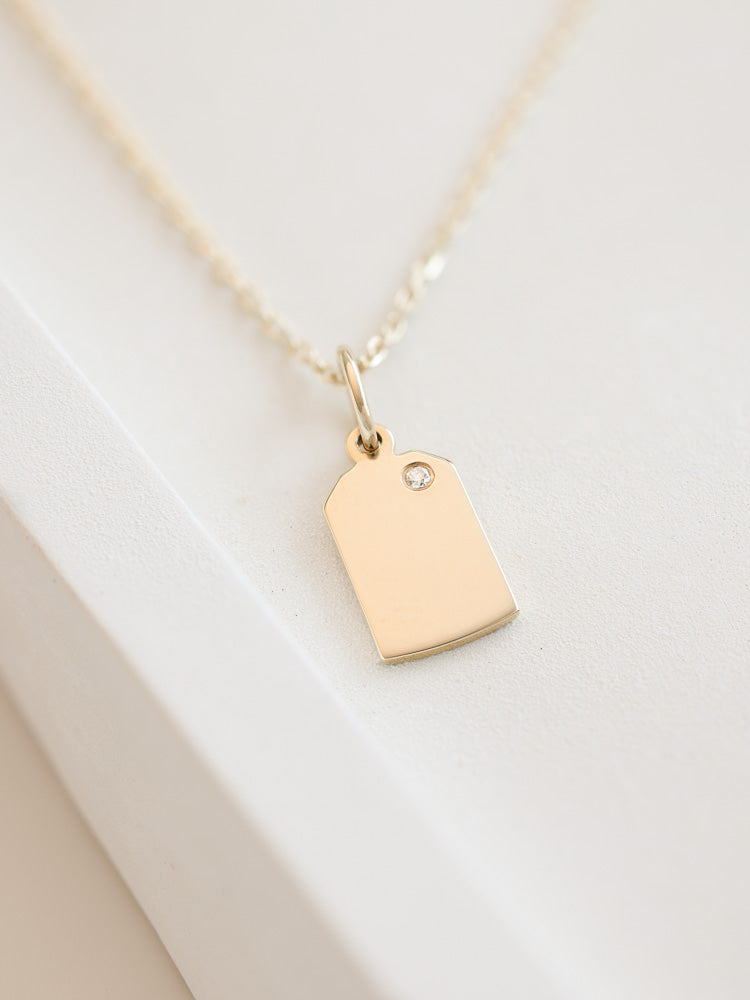 A high polished tag design with the dainty diamond for the perfect touch! Ask us about engraving it!