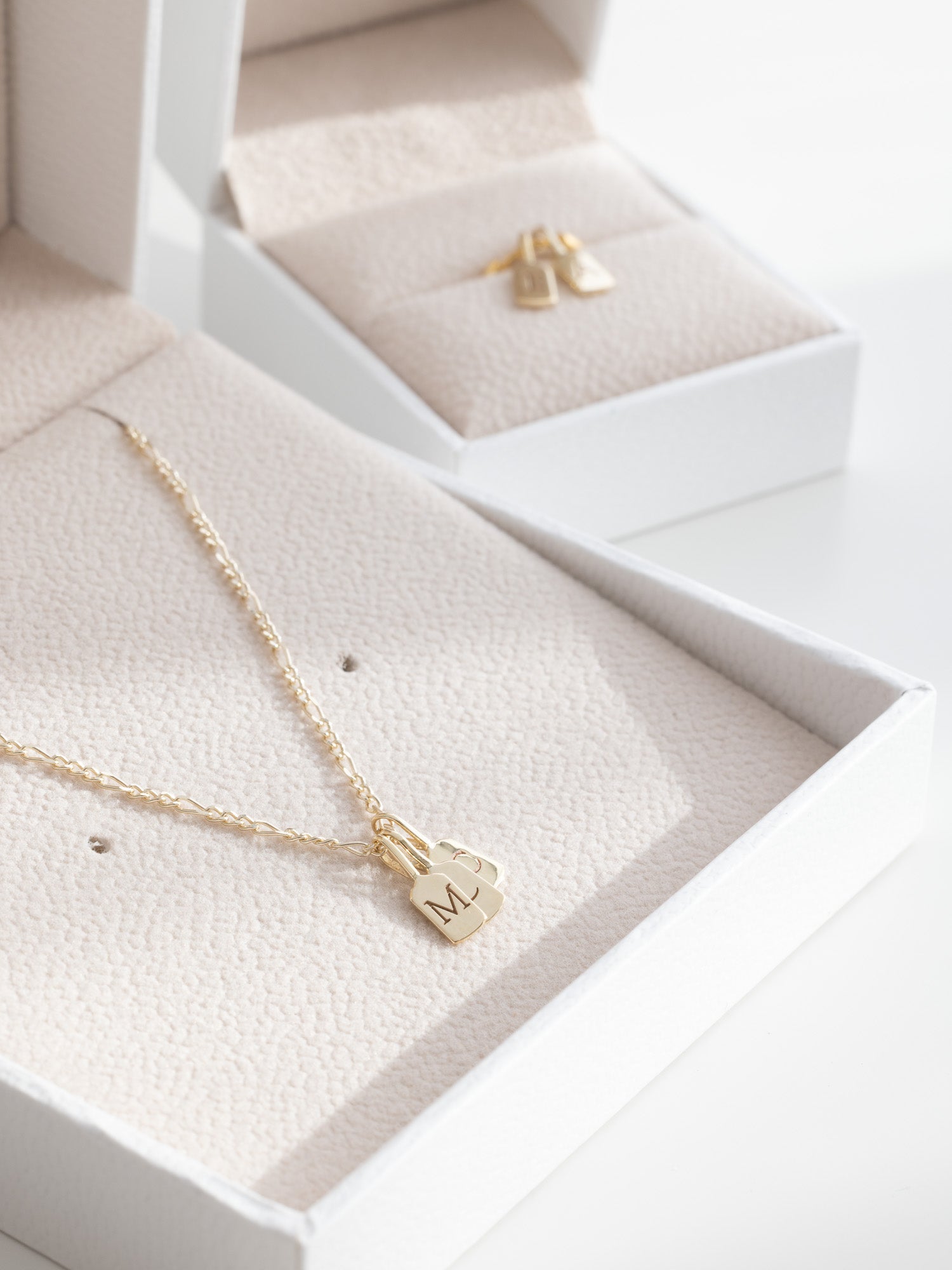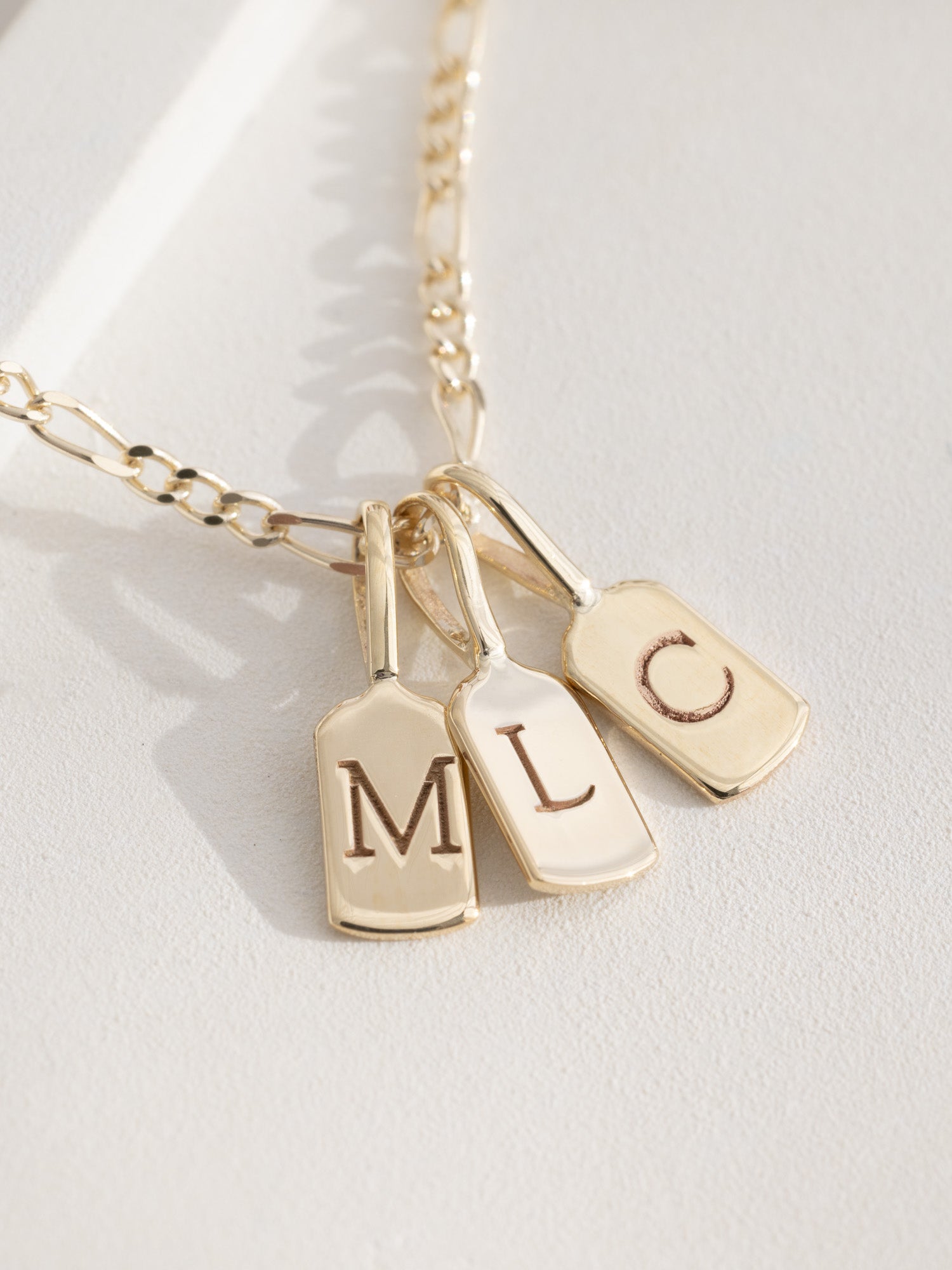 The delicate typewriter-style font allows it to hang as a single charm or be layered with other Luna Letters, creating a personalised piece. Available as a standalone charm or with a solid gold chain of varying lengths, it's a lightweight yet distinctive accessory.