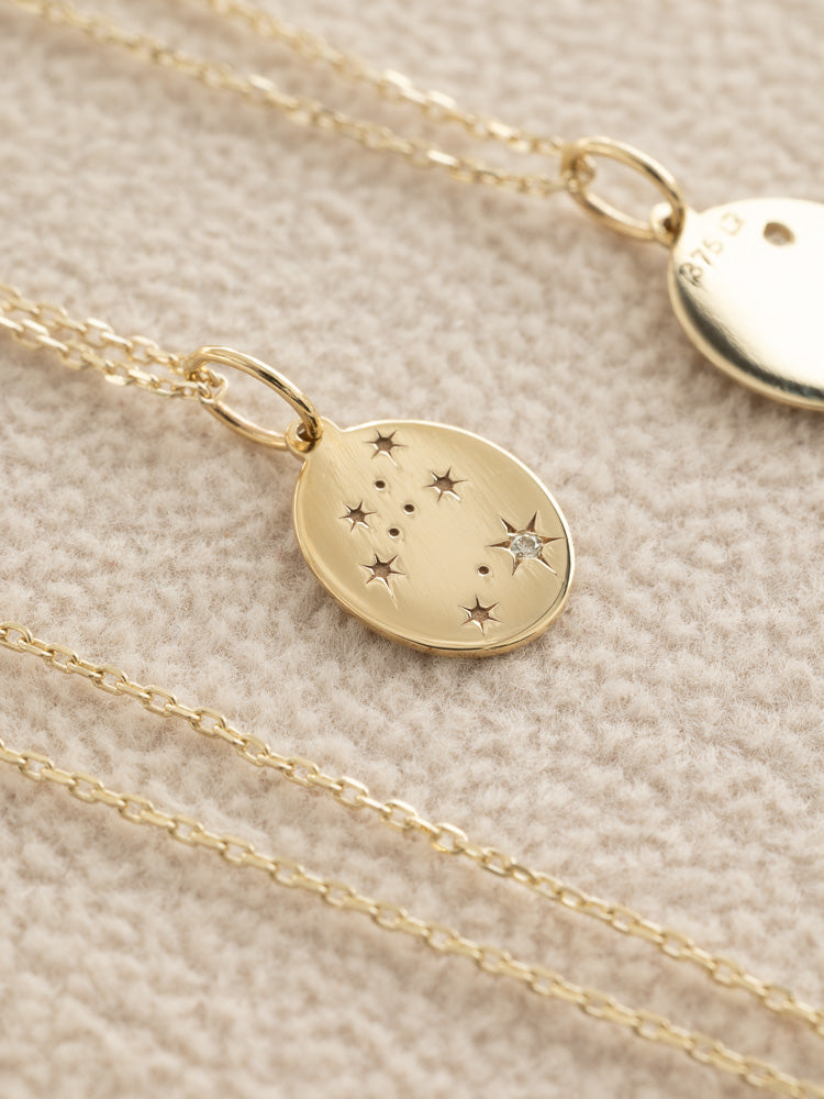 Available as a pendant or paired with either a 40cm or 45cm solid gold chain with a 5cm extension, this necklace is adaptable, meaningful, and personal to your astrological sign.