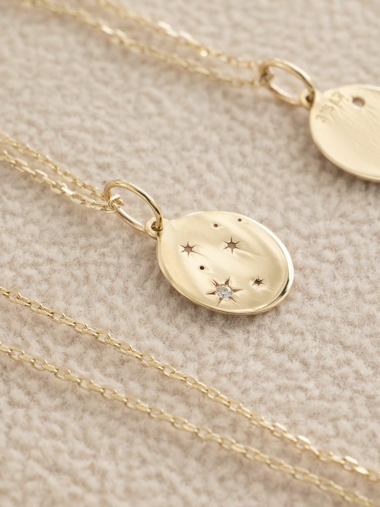 The pendant represents the constellation pattern, crafted from solid 9K gold with a single white diamond.
