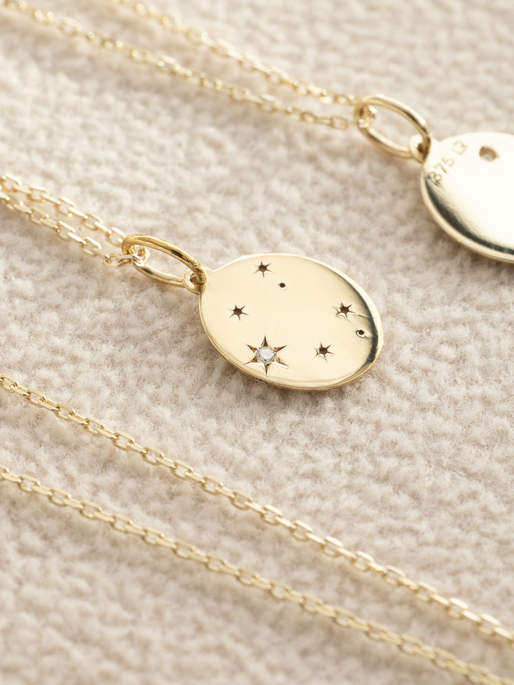 The pendant represents the constellation pattern, crafted from solid 9K gold with a single white diamond adding a touch of sparkle.